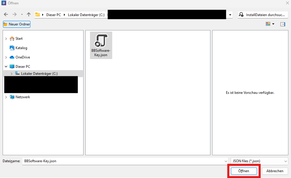 Die Datei BBSoftware-Key.json markieren und über Öffnen laden.