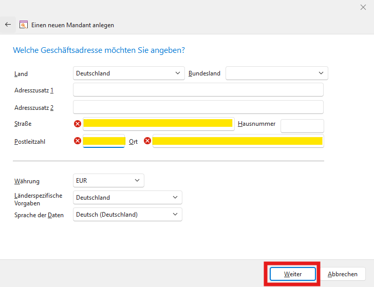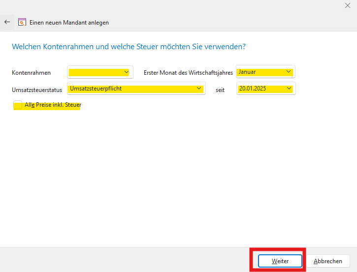 Hinterlegen des Kontenrahmens und Steuerdaten.