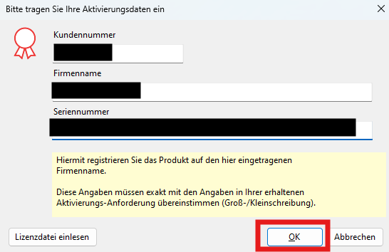 Bitte diese Felder manuell ausfüllen und mit OK bestätigen.