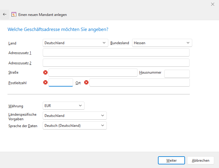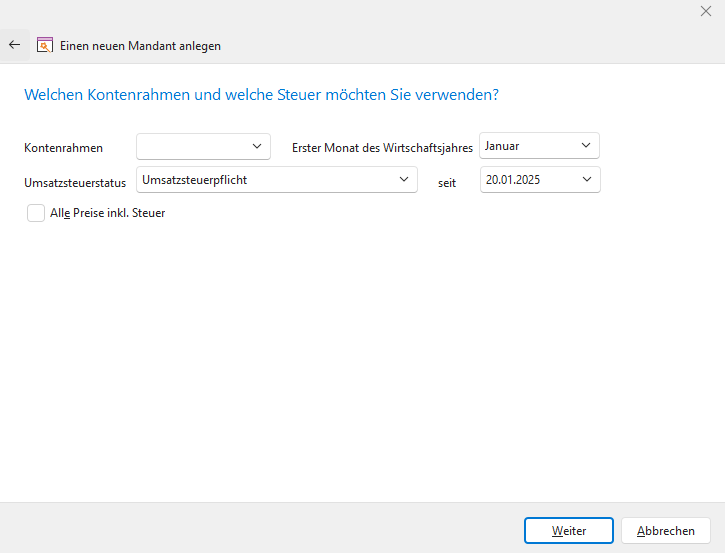 Hinterlegen des Kontenrahmens, erster Monat des Wirtschaftsjahres und