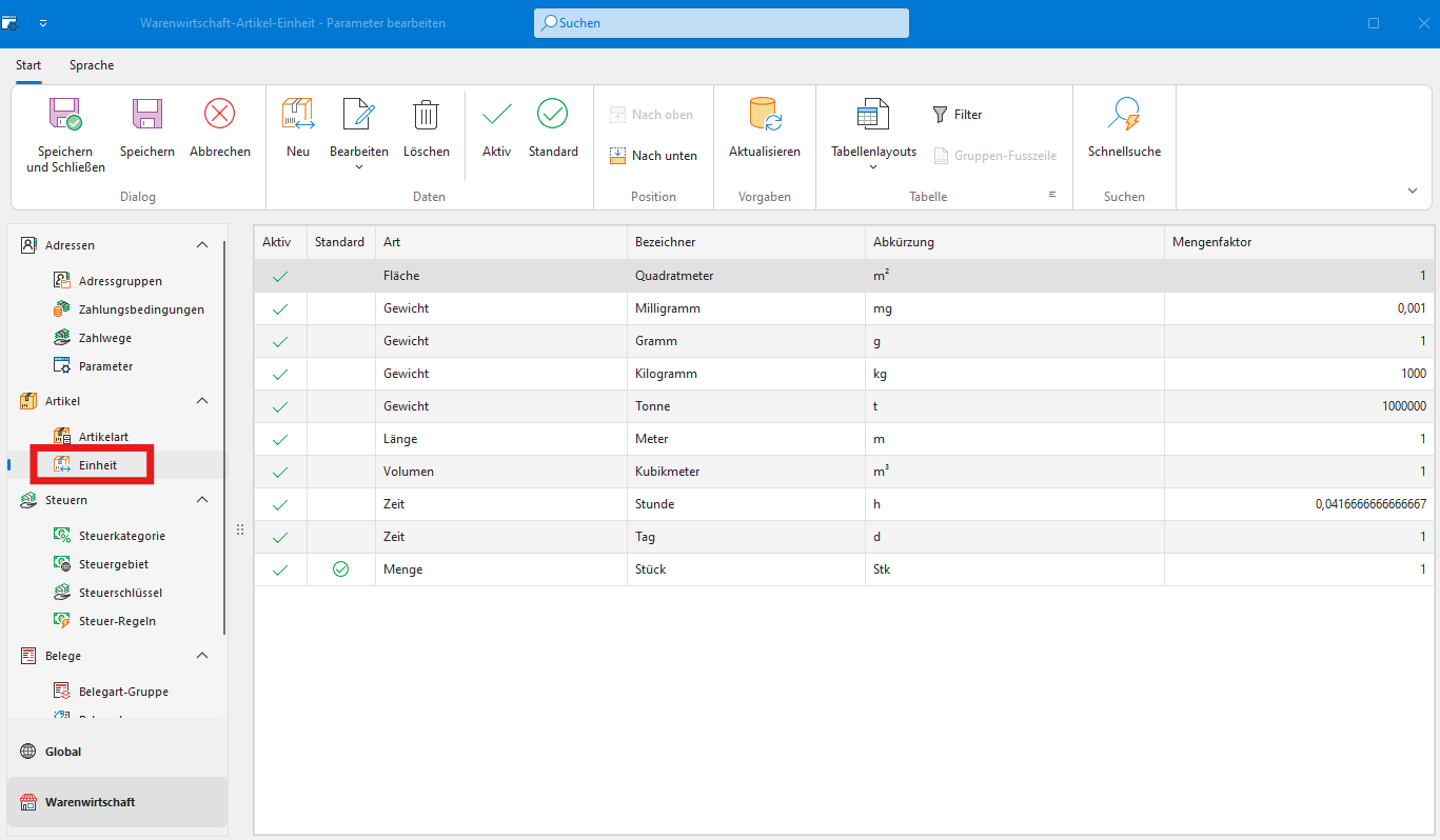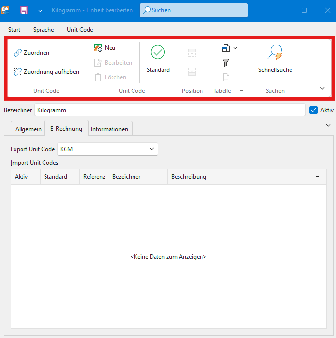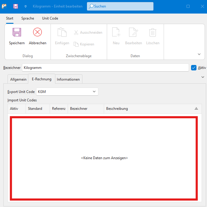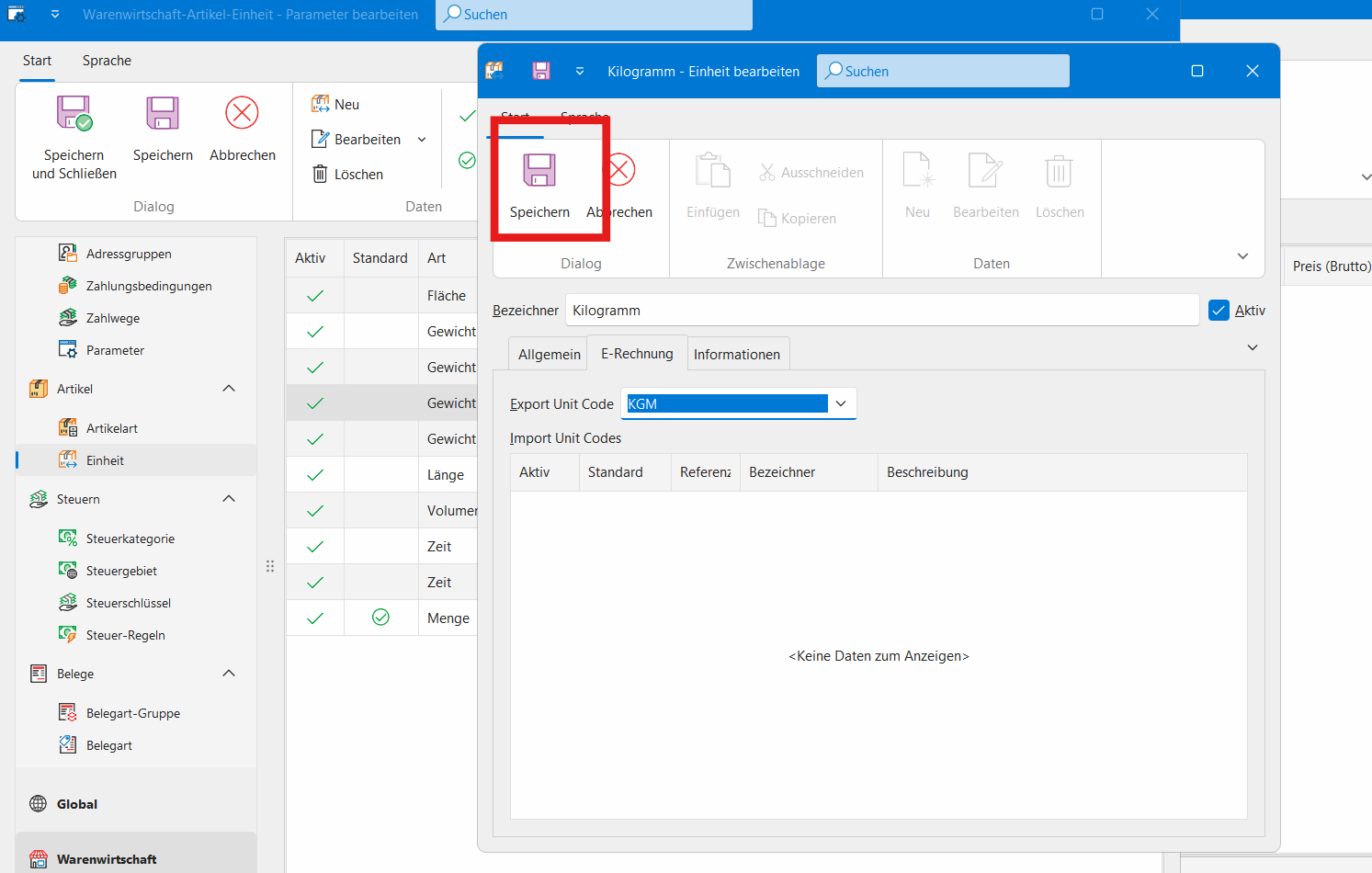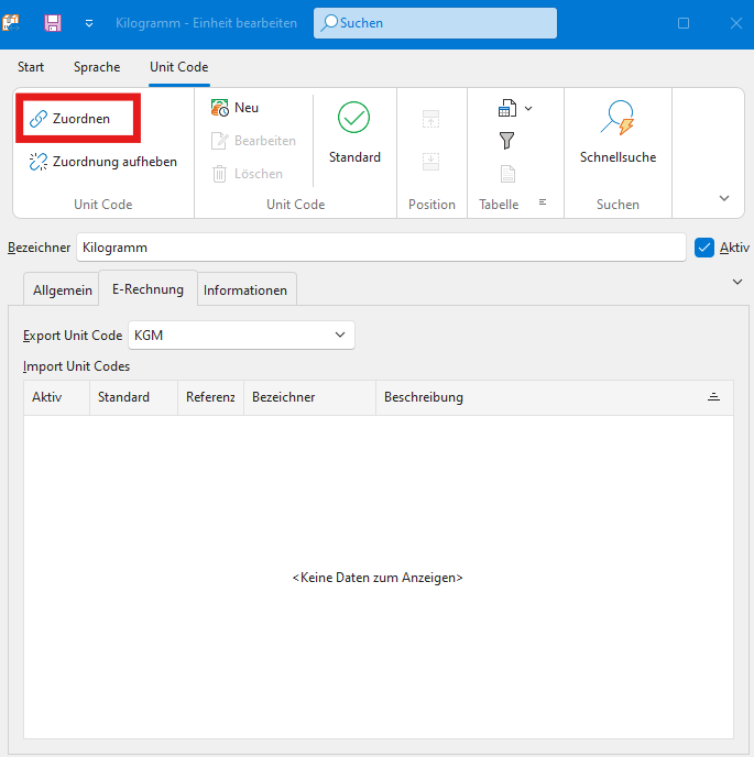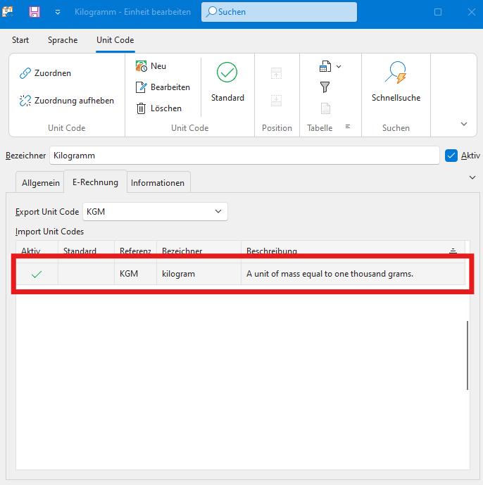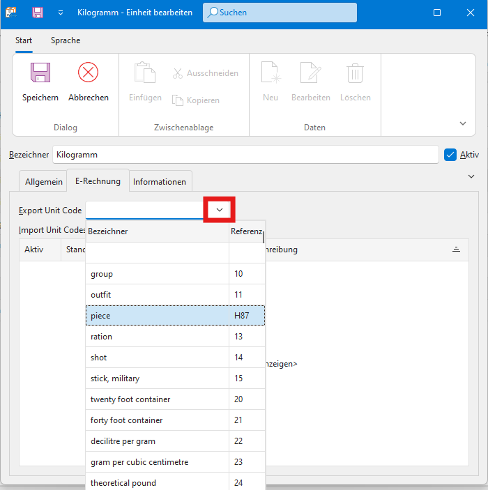 - Hinterlegen des Export Unit Codes, dieser wird für den E-Rechnungs-Ausgang verwendet.