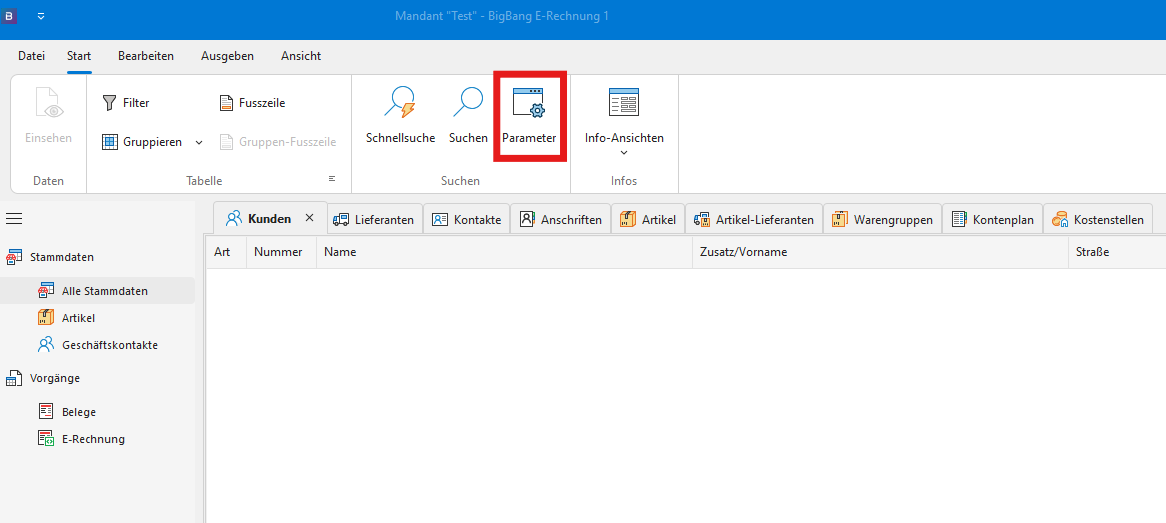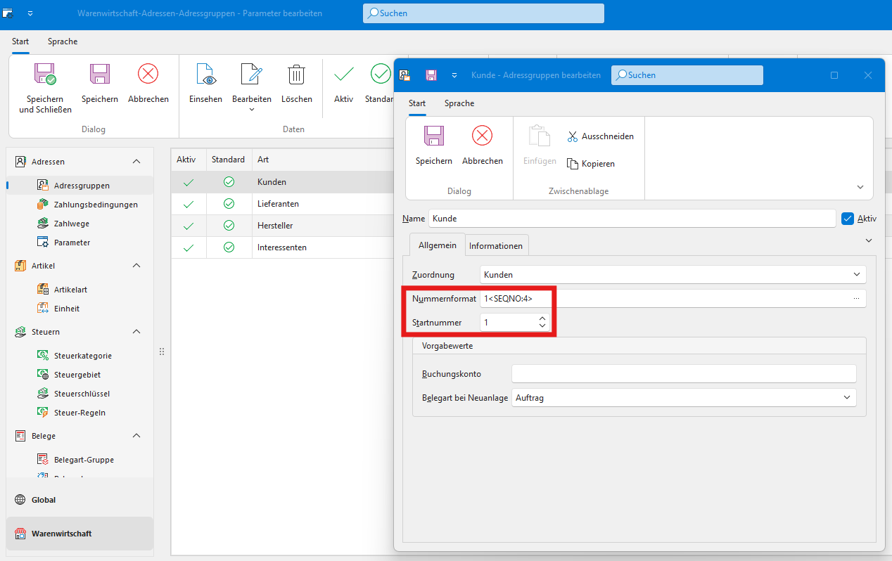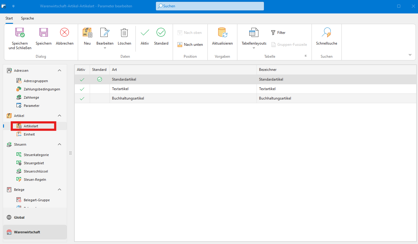 Bitte nun alle weiteren Einträge in der Tabelle Adressegruppe prüfen. - Navigieren zu: Artikel - Artikelart
