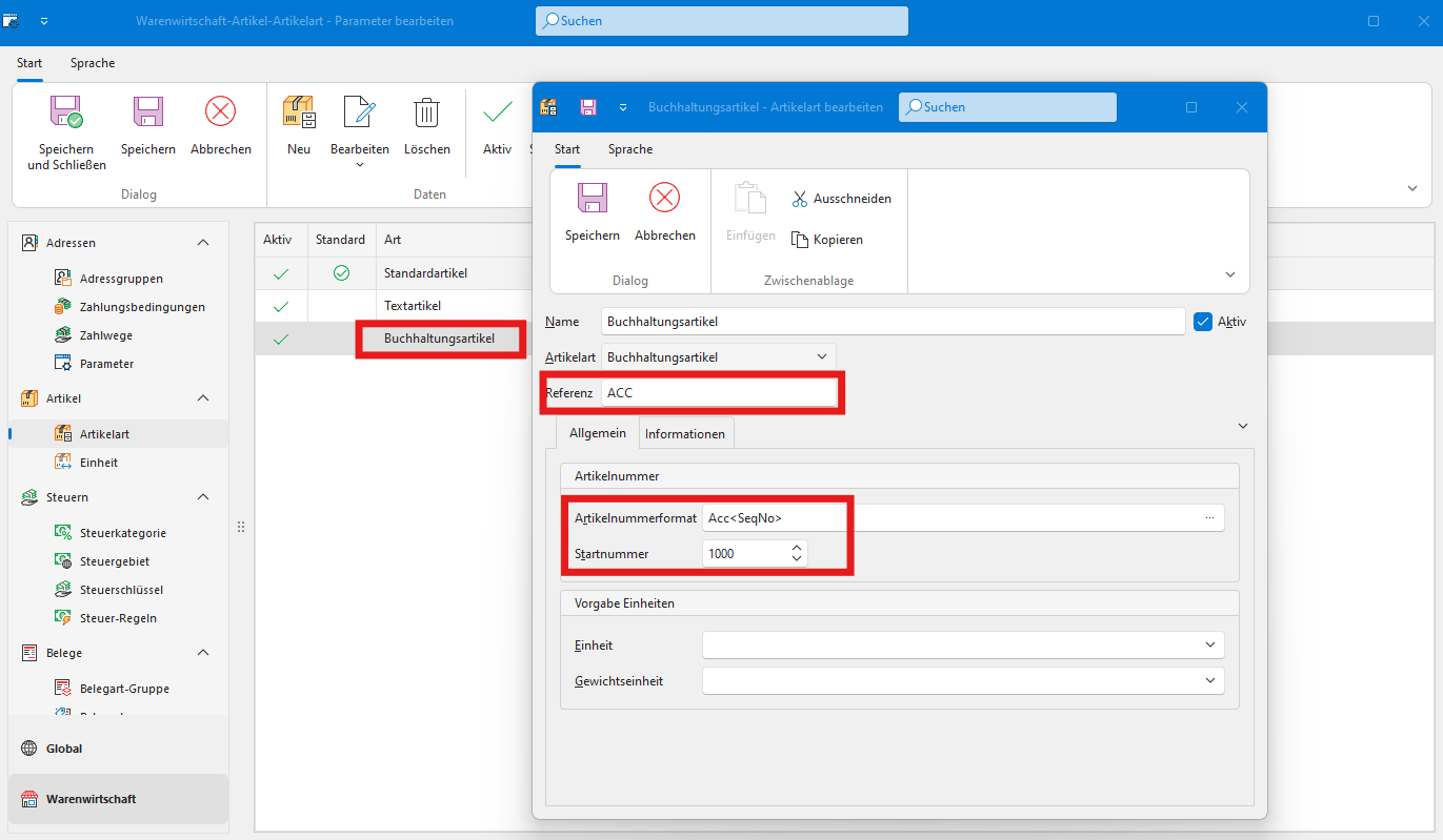 - Anpassen des Artikelnummerformats des Buchhaltungsartikels.