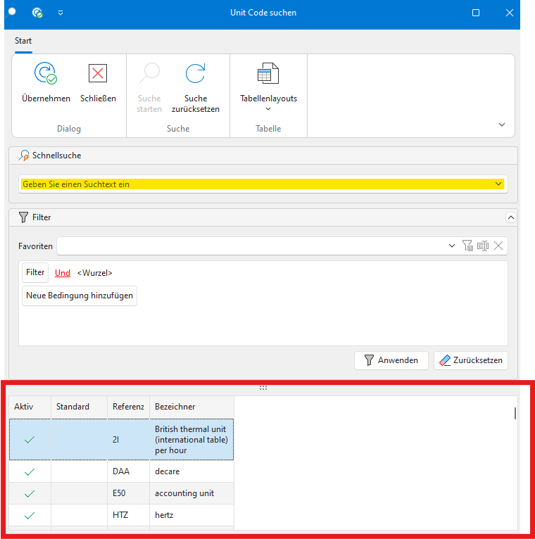 Die Schnellsuche kann verwendet werden, um die Werte einzugrenzen.