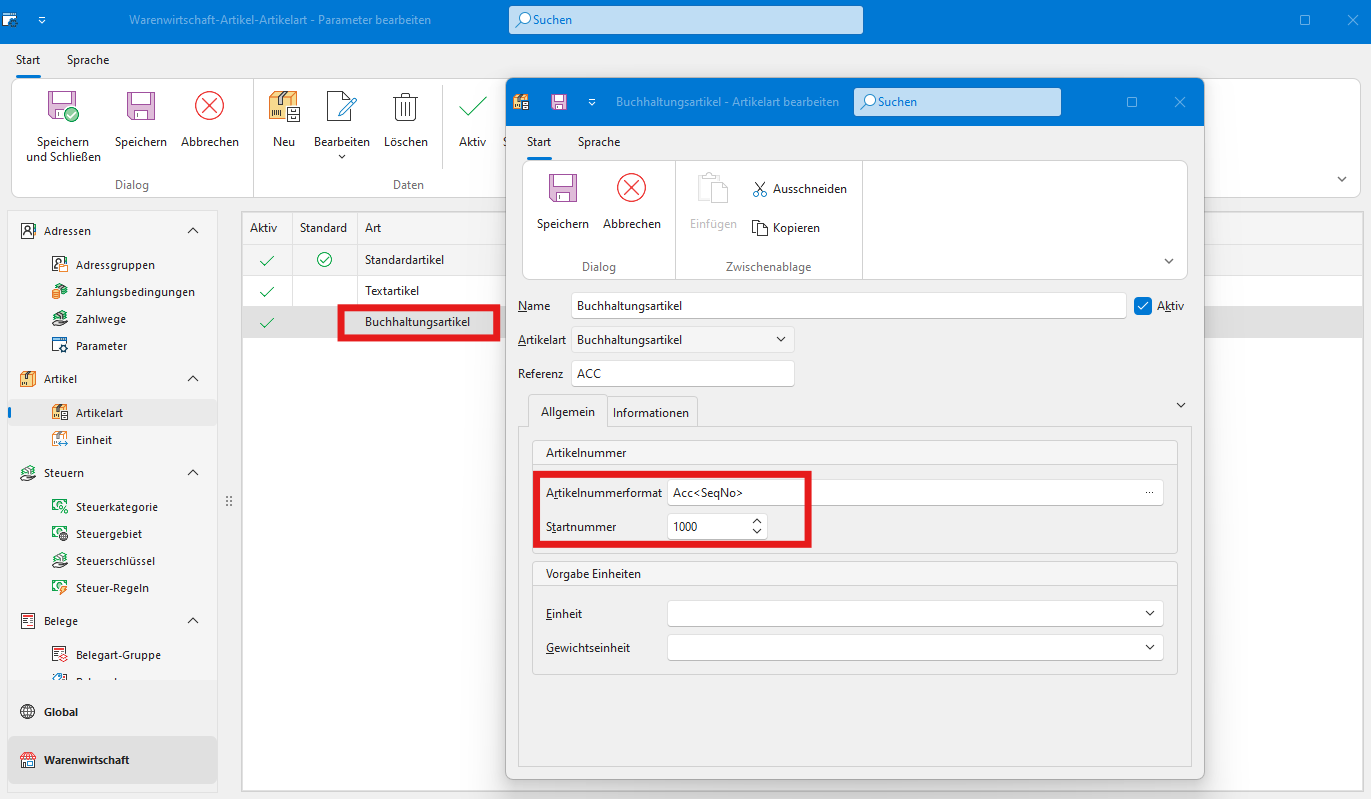 Artikelart -> Buchhaltungsartikel -> Artikelnummerformat anpassenEinheit -> Anpassen der Daten für E-Rechnung bei Einheiten